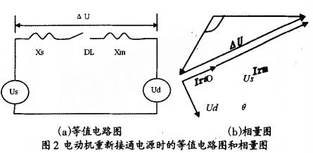 圖1所示為母線槽系統的某一段接線圖,圖2為電動機切換時的等值電路圖。圖中Us-電源電壓;Ud-母線槽上電動機的殘壓;Xs-電源等值電抗;Xm-母線槽上電動機組和低壓負載的等值電抗(折算到高壓母線槽壓);AU-電源電壓與殘壓之間的差拍電壓。