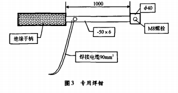 由于焊接時(shí)電弧長(zhǎng),溫度較高,焊工操作時(shí)要盡可能的遠(yuǎn)離工件,因此特制一把專用焊鉗,如圖3。