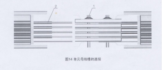 先取出序號1銜接螺栓,然后將序號2母線槽插入,再穿上序號1銜接螺栓,墊入碟形墊圈,用扭力板手將螺母擰緊(扭趴不小于6ONm),然后裝上蓋板(見圖),擰緊接頭螺栓足母線槽銜接的保證。緊固后的接頭查看要求用0.1mm的塞尺不能插進。