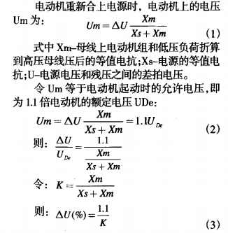 圖2所示為電動(dòng)機(jī)從頭接通電源時(shí)的等值電路圖和相角圖,從圖中能夠看出,不同的0角(電源電壓和電動(dòng)機(jī)殘壓二者之間的夾角),對應(yīng)不同的△U值,如0=180o時(shí),AU值最大,假定此刻從頭合上電源,對電動(dòng)機(jī)的沖擊最嚴(yán)峻。依據(jù)母線槽上成組電動(dòng)機(jī)的殘壓特性和電動(dòng)機(jī)耐受電流的才干,在極坐標(biāo)上可繪出其殘壓曲線。