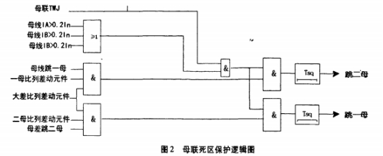 若母聯(lián)開關(guān)和母聯(lián)TA之間發(fā)生故障,斷路器側(cè)母線槽跳開后故障依然存在,正好處于TA側(cè)母線槽小差的死區(qū),為進(jìn)步保護(hù)動作速度,本設(shè)備專設(shè)了母聯(lián)死區(qū)保護(hù),其邏輯框圖如圖2。