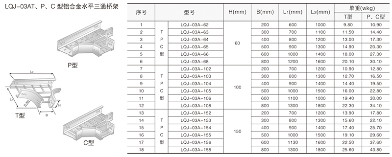 鋁合金電纜橋架在某種結(jié)構(gòu)形式中無(wú)其它結(jié)構(gòu)形式中的某-種產(chǎn)品類別,選型可作代用表示。例如:在LQU-CC型槽式鋁合金電纜橋架結(jié)構(gòu)形式中,無(wú)鋁合金配線橋架中的LPC-03D, 即表示為LFC-CC-03D。